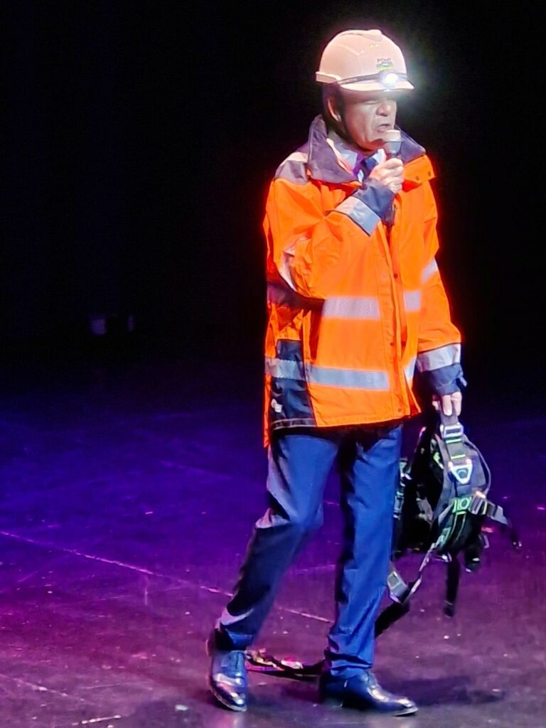 Ce maire atypique, qui aime se déguiser, est apparu à trois mètres de haut, installé dans une nacelle, en plein milieu de la scène, en tenue d’agent de la collectivité